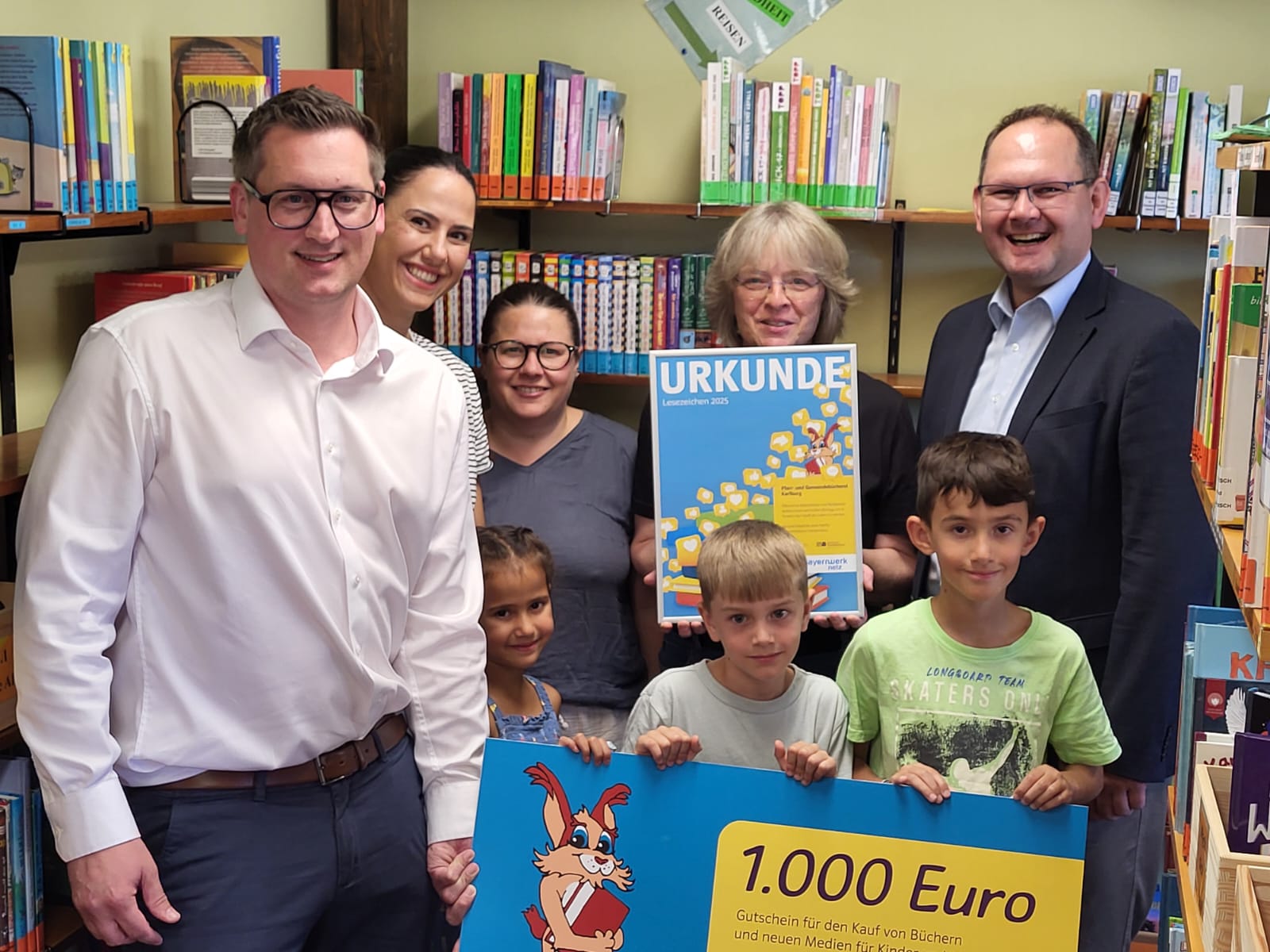 Die Bücherei wurde mit dem "Lesezeichen" ausgezeichnet und freut sich über 1000 Euro, die vom Kommunalbetreuer des Bayernwerks, Michael Weißenberger, an Wally Herzog überreichte. Weißenberger sagte: "Büchereien sind mit Ihrem Einsatz und ihren Angeboten eine enorme Bereicherung (...)" und auch unser Bürgermeister ist sehr stolz auf das ehrenamtliche Engagement für die Bücherei.